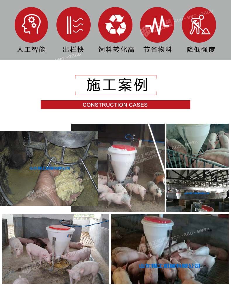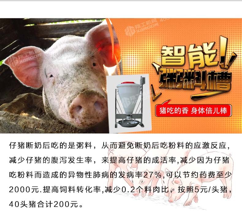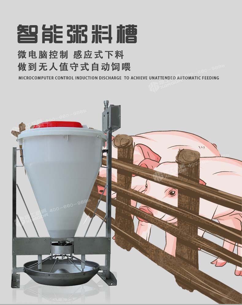 即便按照三個好處累加保育一次可以節約560元,一年按照使用粥料器保育6—8窩仔豬,累加一臺粥料器智能豬料槽通過在豬場的試驗得出驗證,解決了飼料轉化率,豬通過食料相比之前的飼喂每天多增重0.4斤,減少和杜絕了胃腸道病的發生幾率。合理采食的同時減少了飼料的浪費,省料即是省錢,普通的飼喂飼料浪費率在5%-10%,豬場中使用了粥料器后飼料浪費率控制在2%左右。減少人員的勞動強度,夜晚無法定量投喂的問題。
