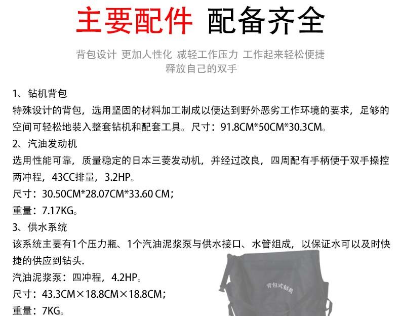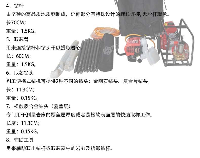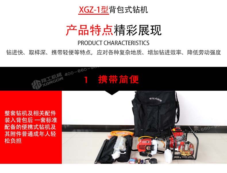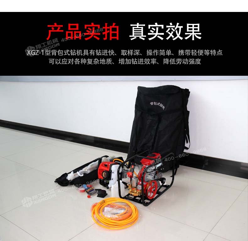 XGZ-1型背包式鉆機具有鉆進快、取樣深、操作簡單、攜帶輕便等特點,可以應對各種復雜地質、增加鉆進效率、降低勞動強度,適用于高山、野外等交通不便的地形、勘探、石油勘測、礦物考察、建筑取樣、爆裂鉆孔等工作,可以卓效的替代中型巖芯鉆機的淺層巖芯取樣勘探工作。