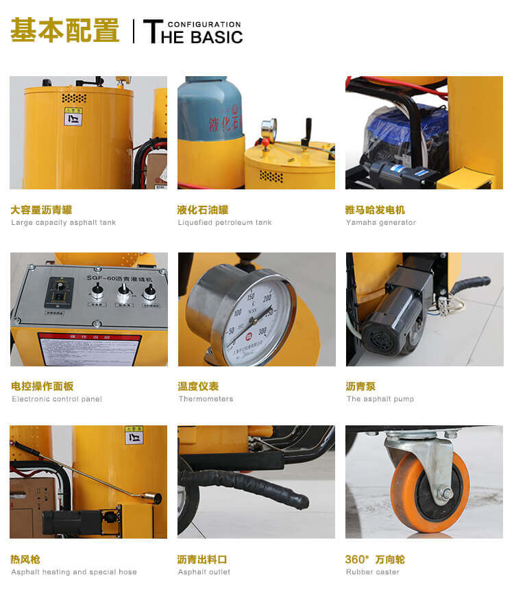60升瀝青灌縫機采用名優發電機,性能穩定;液化氣加熱,方便靈活;超大瀝青罐;出料管路全程加熱,避免堵塞。