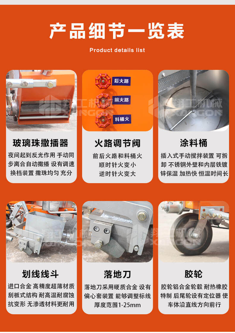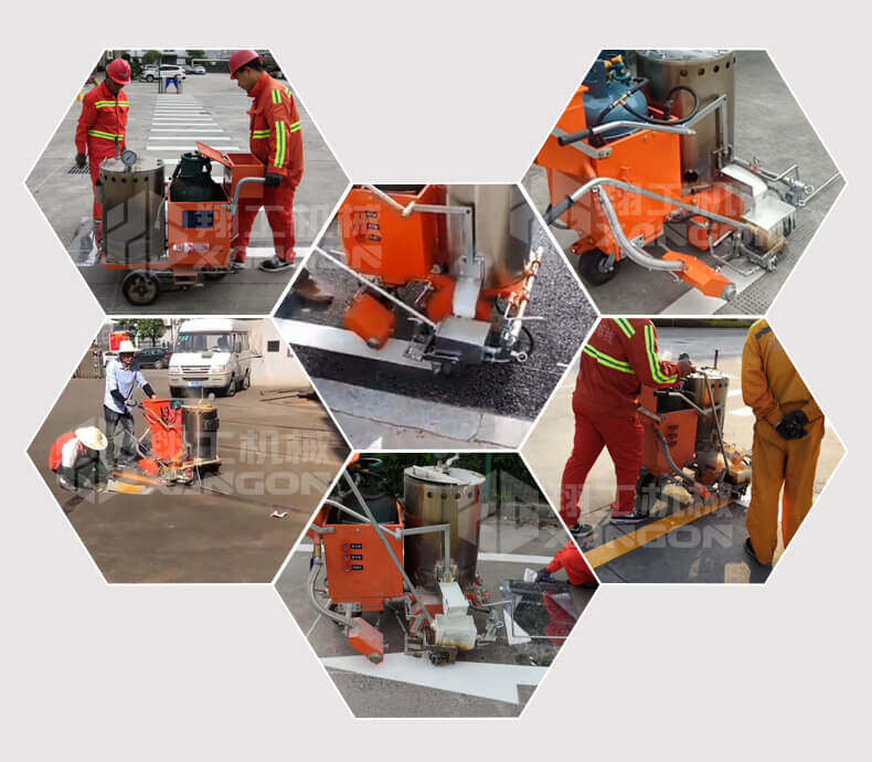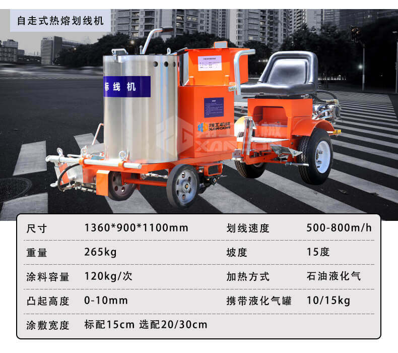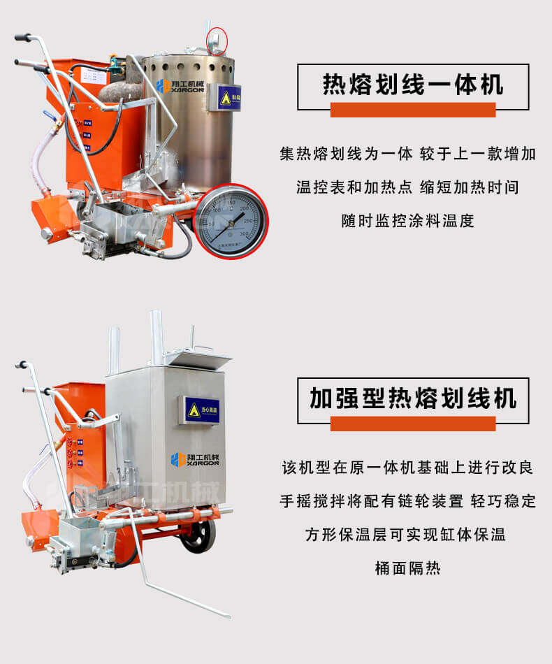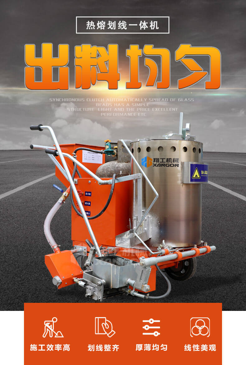 小型路面熱熔劃線一體機顧名思義是集熔料與劃線于一體,可自行完成各類線型的施劃的路面機械。傳統的熱熔劃線施工由于熱熔劃線機不具備高能的熔料的能力,需要熱熔釜的配合,要先將熱熔釜搭載在貨車上或者皮卡車上使用,受建筑層高和施工場地面積的局限,這款熱熔劃線一體機,道路劃線機,產品無損路面,成本低,效益高,劃線美觀,平行,使用壽命長,價位也非常合理。