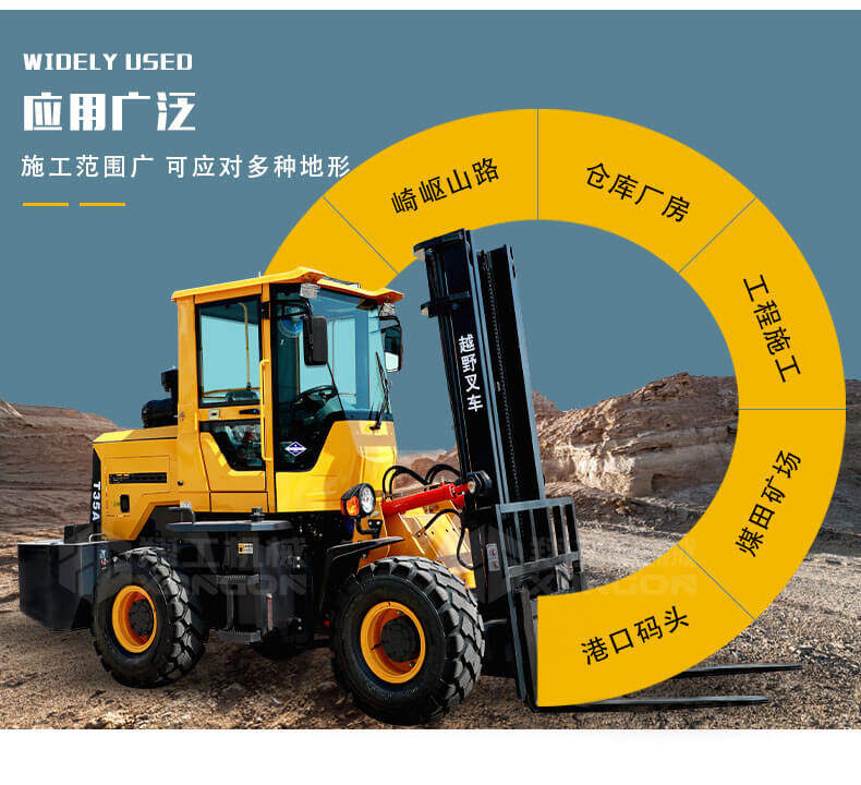 矮腳虎款越野叉車是四驅越野叉車中常見的一款,其具有良好的機動性、越野性可靠性,可以在坡地和不平地面上進行貨物裝、卸、堆垛及搬運作業,主要用來轉運石料、設備、貨物、城市垃圾箱以及集裝物料等.多用于道路修筑、城市建設、環境衛生、石料場、中小型土木工程、車站、碼頭、貨場、倉庫等地方。