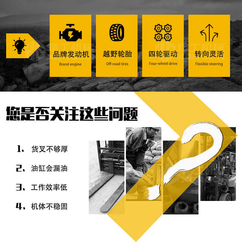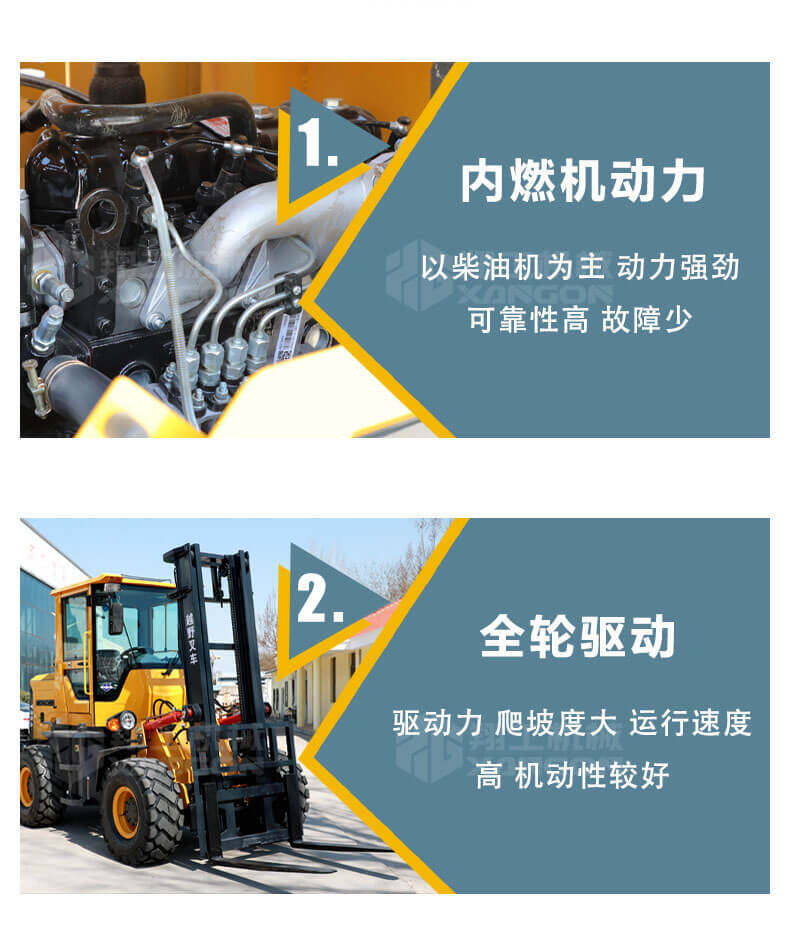 3.普通叉車只能在平整的路面上作業,而越野叉車既可以在普通路面上作業,還可以在山路泥路崎嶇道路作業,輪胎抓地力強,不打滑。