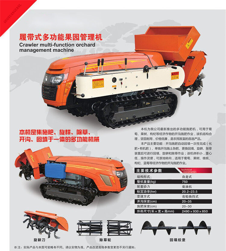 開溝施肥自動回填一次性完成(化肥+有機肥)、單獨開溝施土雜肥、更換回填、旋耕、除草裝置后可進行回填、旋耕和除草作業;該機體積小,操作靈便,可原地轉向,適用于葡萄、果樹、核桃、枸杞、藍莓等經濟作物的開溝施肥作業。