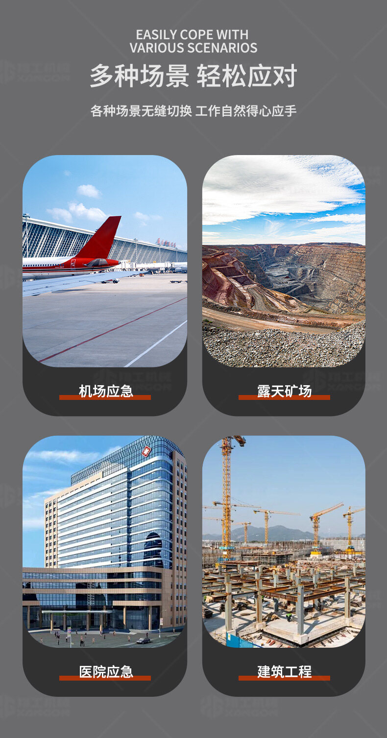 090型工程照明車用于體育場館、機場、碼頭等大型公共場所, 公路、鐵路、電力等緊急搶險現場,露天采礦現場, 以及防洪防汛、搶險救災現場等其它需要緊急備用光源、電源的場合