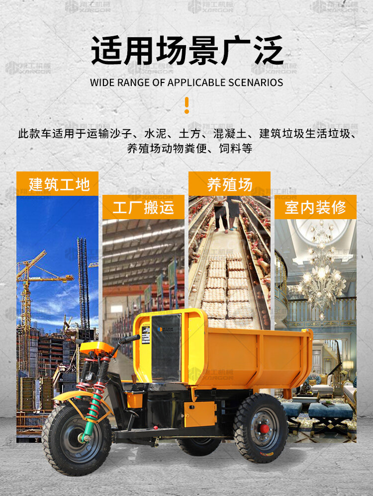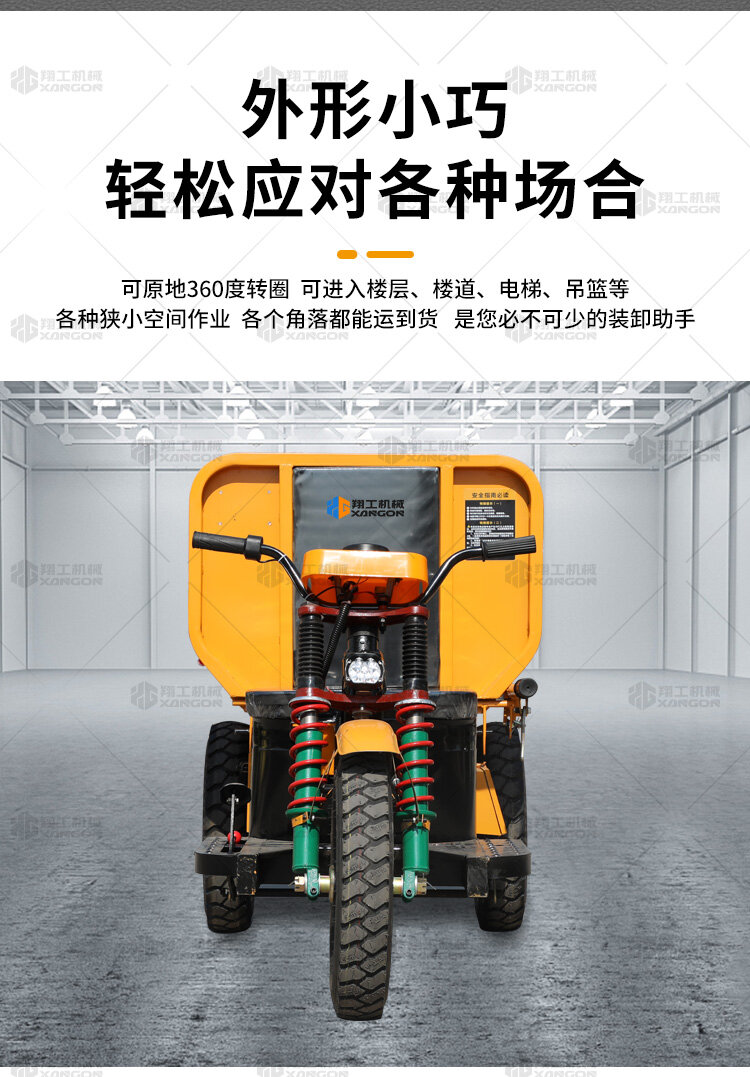 此款車適用于建筑工地、室內裝修、養殖場、工廠等場所,運輸沙子、水泥、土方、混凝土、建筑垃圾生活垃圾、養殖場動物糞便、飼料等,體積小操作簡單靈活,可原地360度轉圈,可進入樓層、樓道、電梯、吊籃等各種狹小空間作業,是您必不可少的裝卸助手。