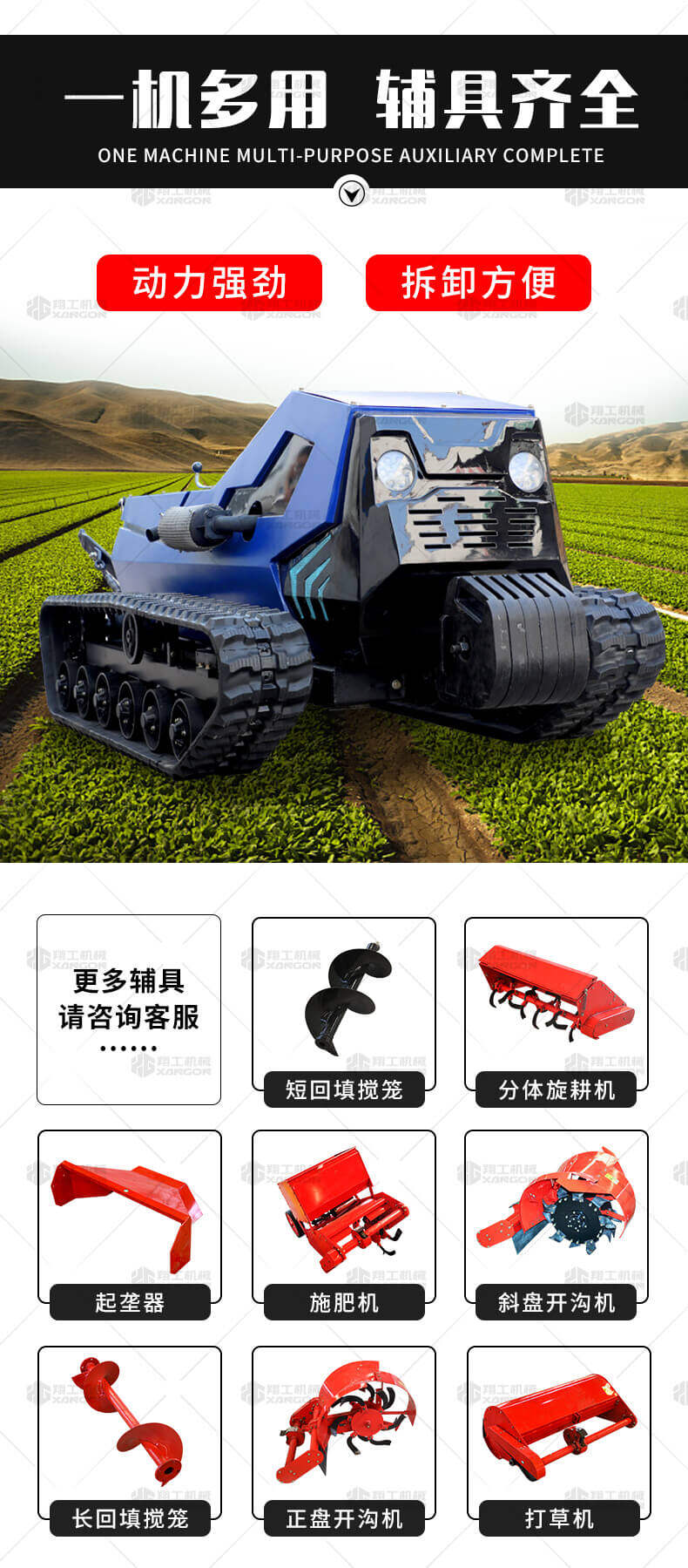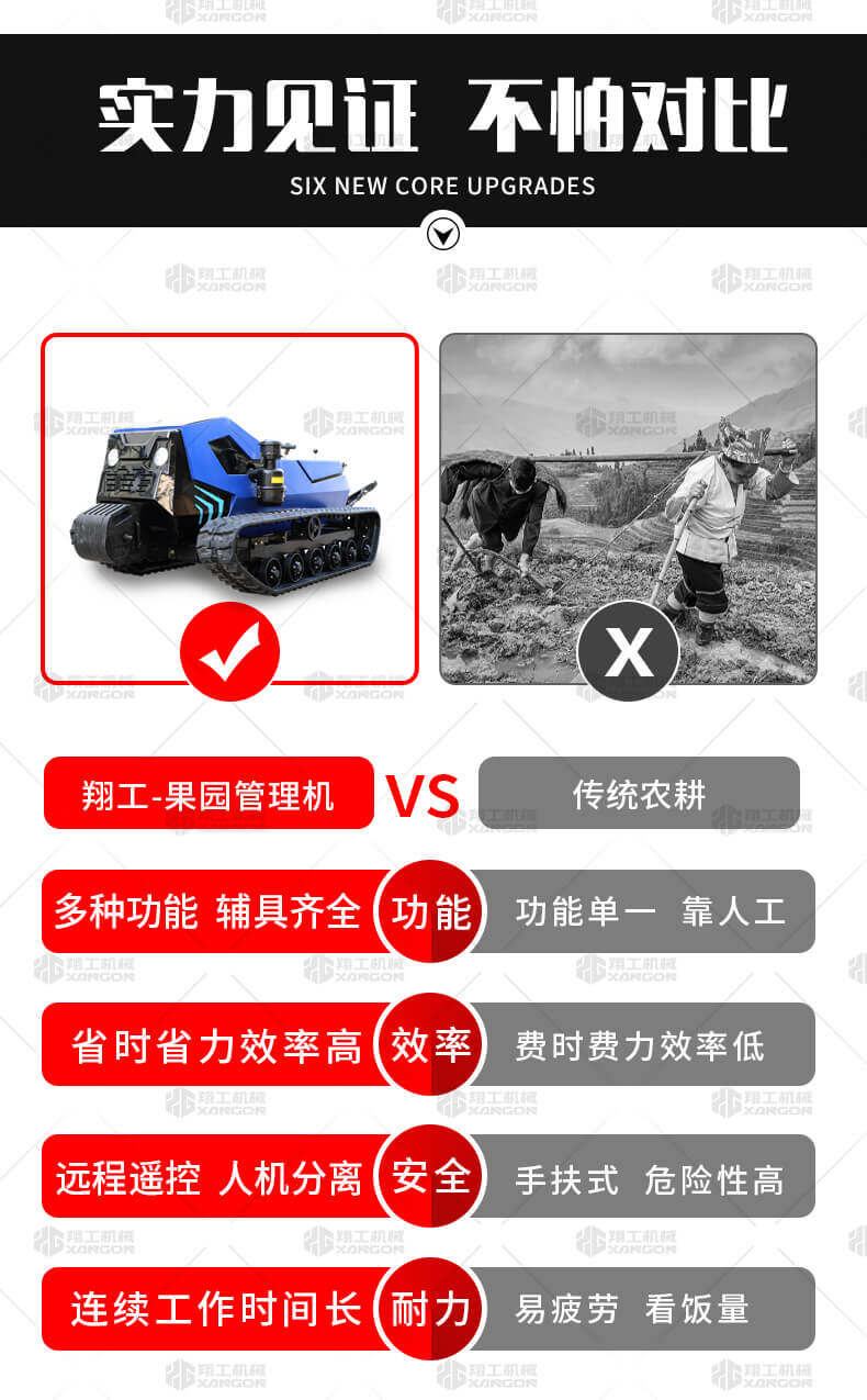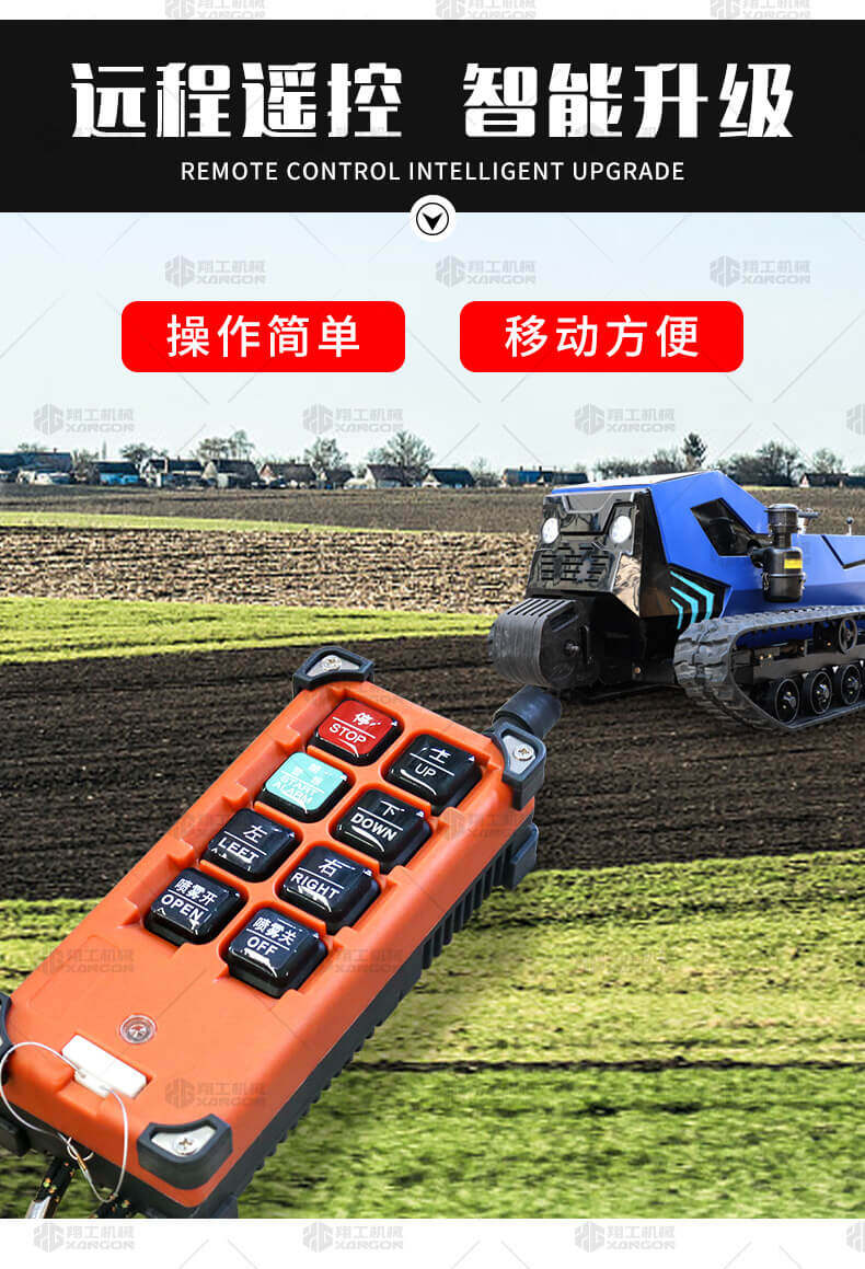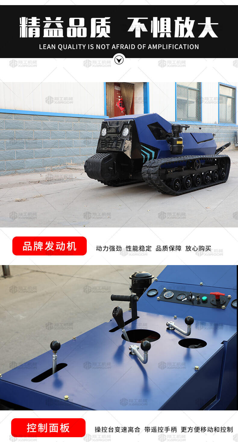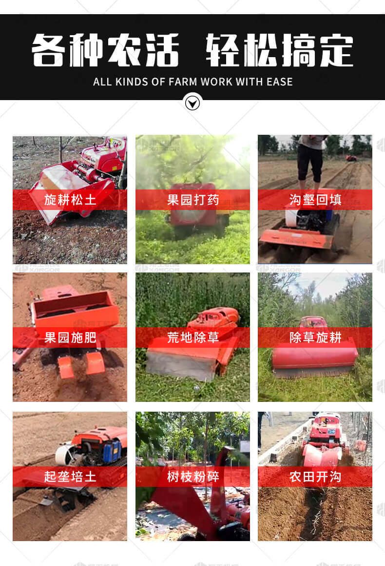 本產(chǎn)品采用履帶式驅(qū)動設(shè)計(jì),穩(wěn)定性和爬坡能力較強(qiáng),適應(yīng)丘陵山地平原各種地形,機(jī)型小功率大,適應(yīng)各種行距的果樹,大棚,園林。產(chǎn)品動力強(qiáng)勁,結(jié)實(shí)耐用,性能優(yōu)越,安全放心,遠(yuǎn)程操控,省心省力。