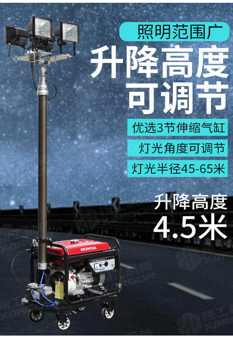 全方位升降工作燈適用于鐵路、電力、公安、消防、石油、石化等各種大型施工作業、事故搶修、搶險救災等工作現場對大面積高亮度照明的需要。