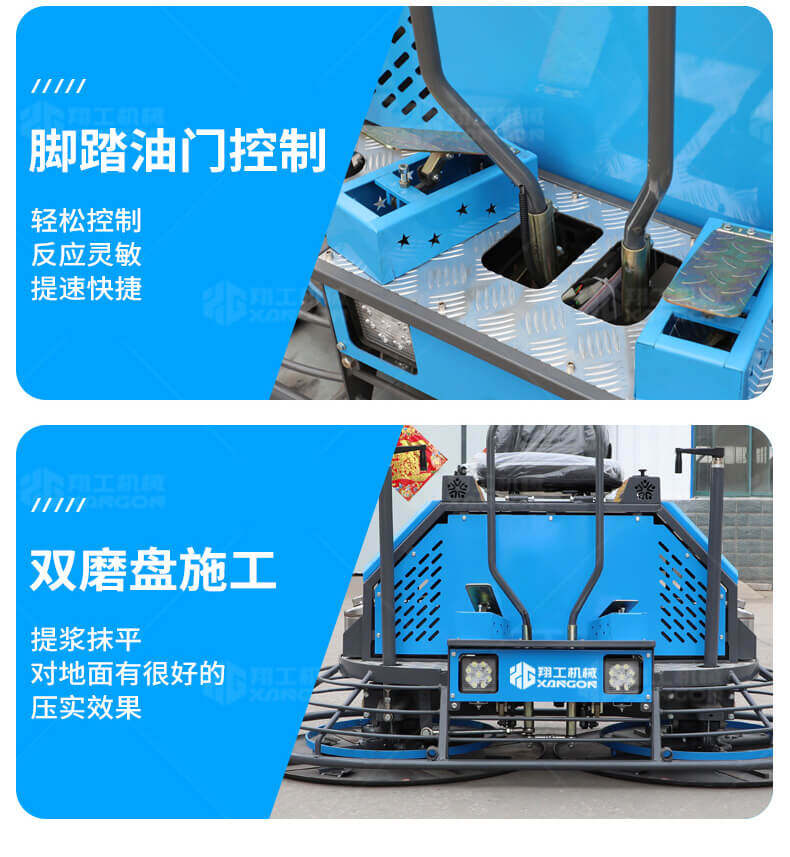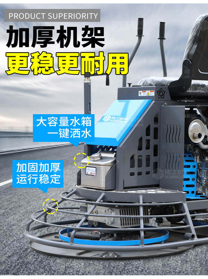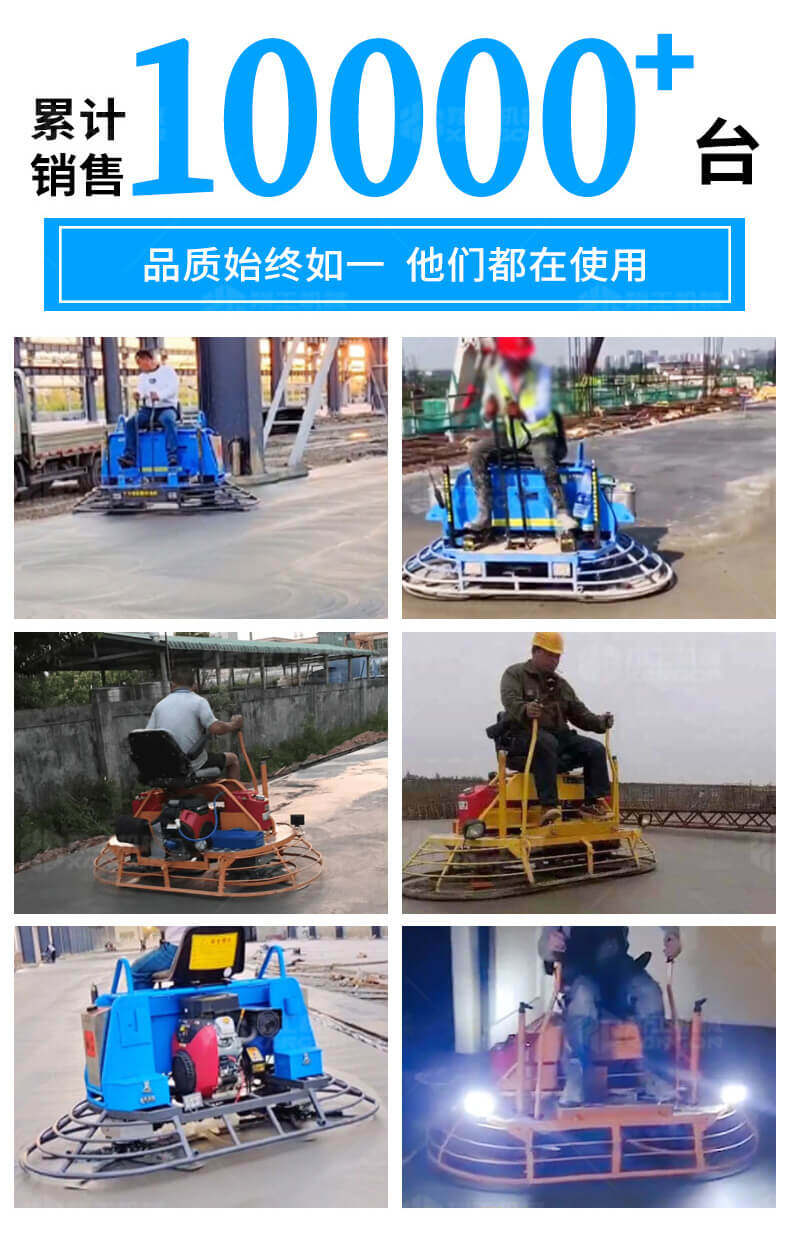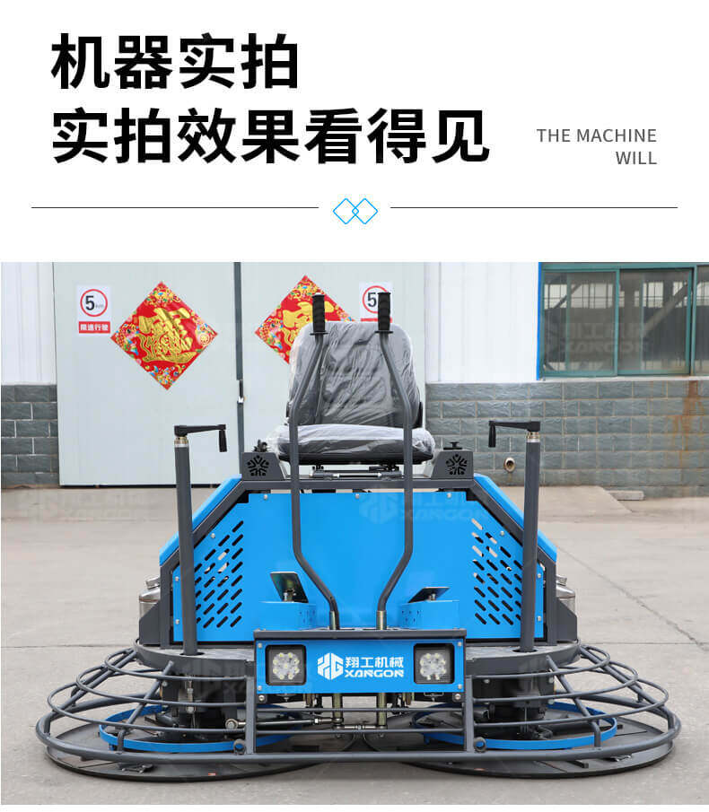 座駕式混凝土抹光機用于混凝土地面的提漿、壓實、抹平、抹光,相對于手扶式抹光機,效率高。