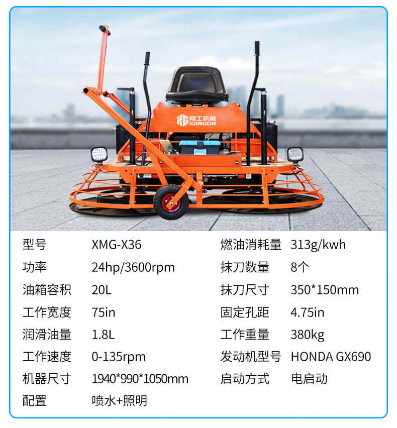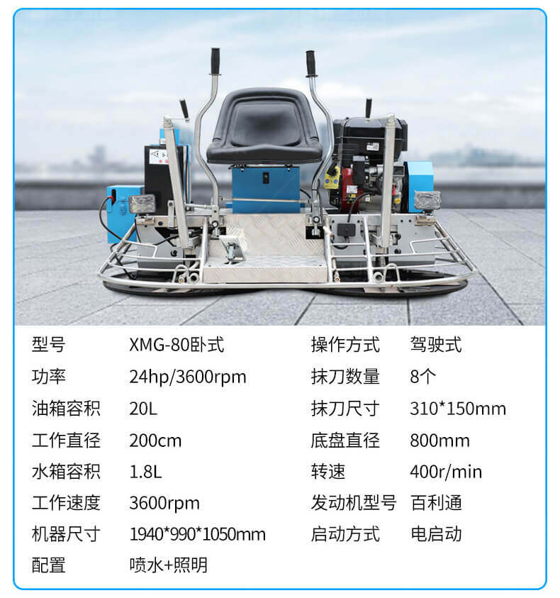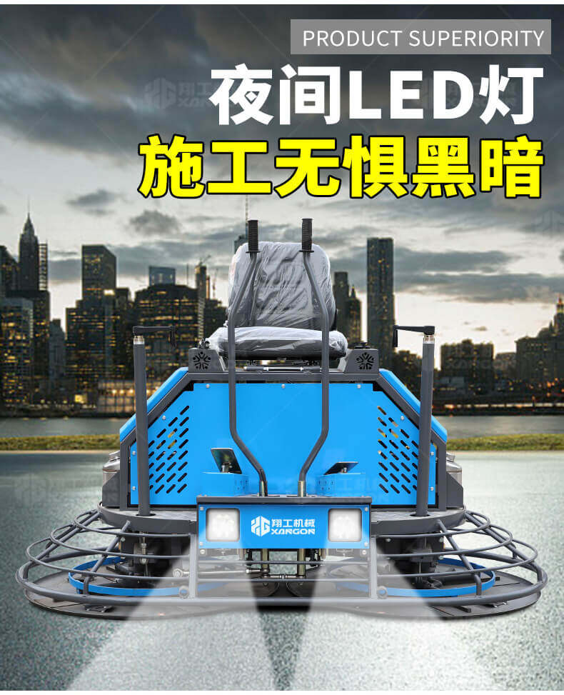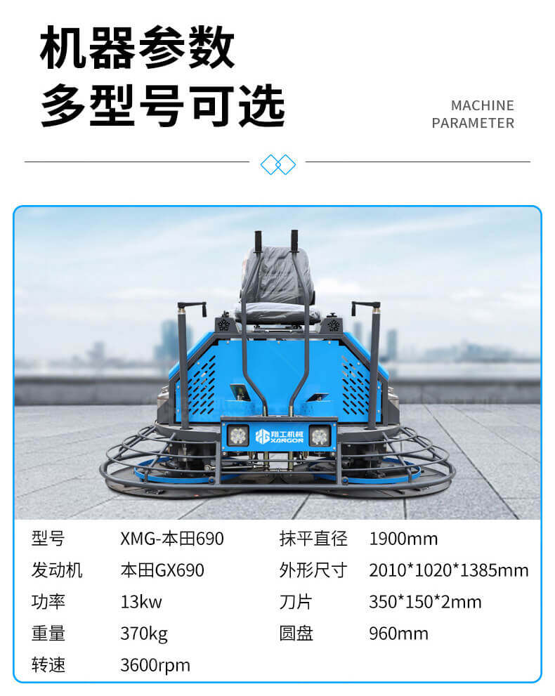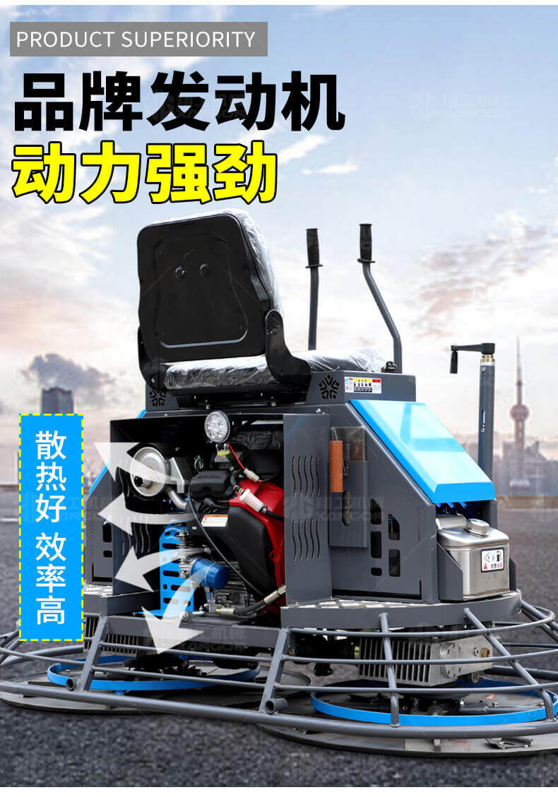 座駕式混凝土抹光機用于混凝土地面的提漿、壓實、抹平、抹光,相對于手扶式抹光機,效率高。