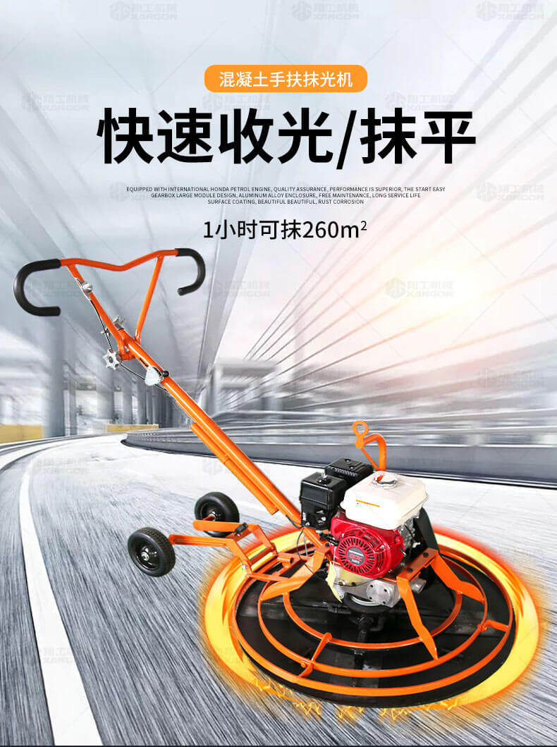 手扶抹光機用于混凝土地面的提漿、壓實、抹平、抹光。裝備國際品牌HONDA汽油機,品牌品質保證,性能優越,啟動容易;變速箱大模數設計,鋁合金箱體,免維護,使用壽命長;