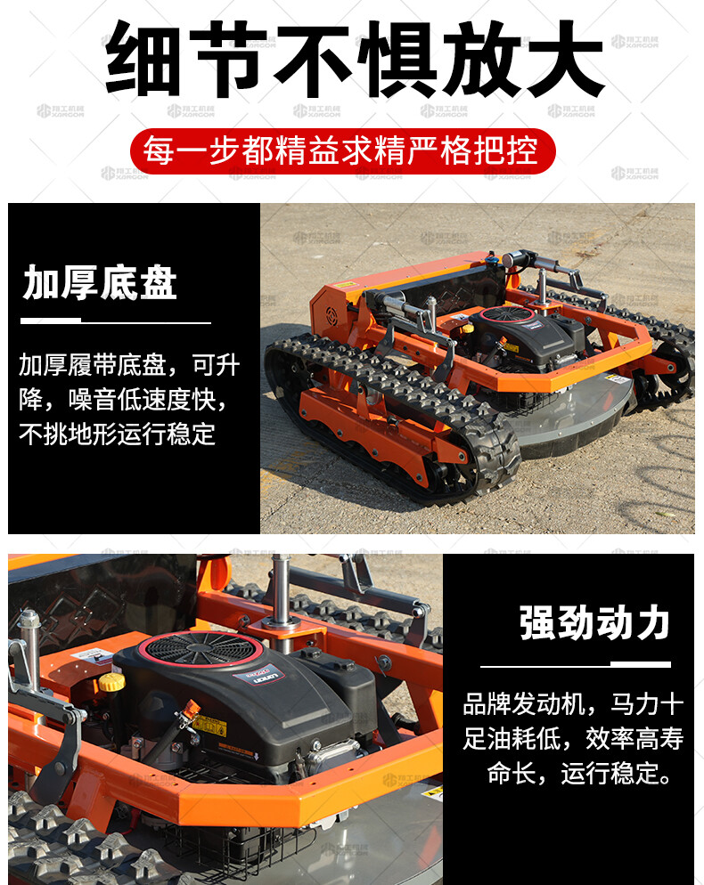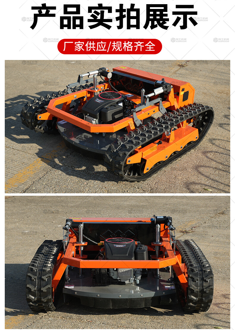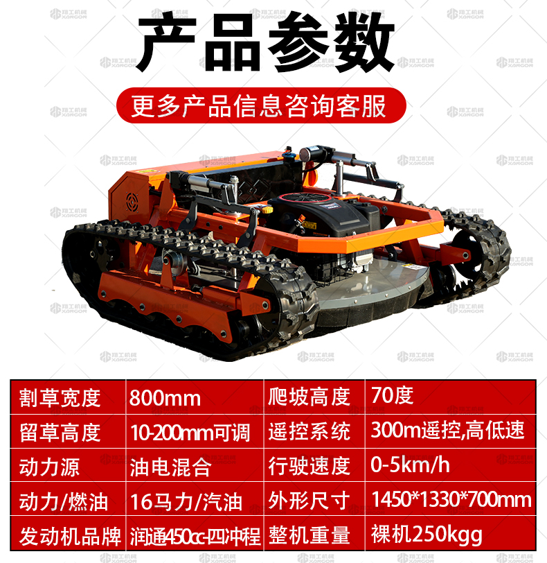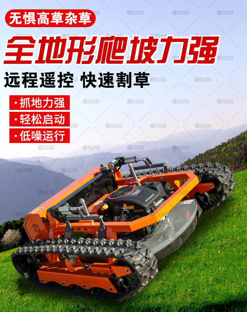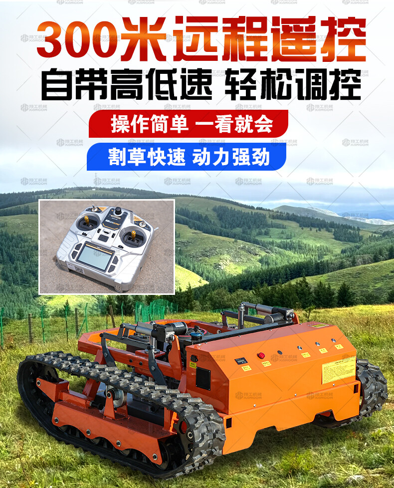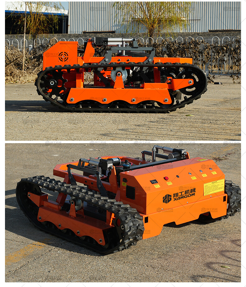 800坦克款割草機是一款專為復雜地形、高強度作業設計的重型遙控割草機,采用坦克式履帶底盤,具備極強的通過性和穩定性,適用于陡坡、泥地、灌木叢等傳統割草機難以作業的場景